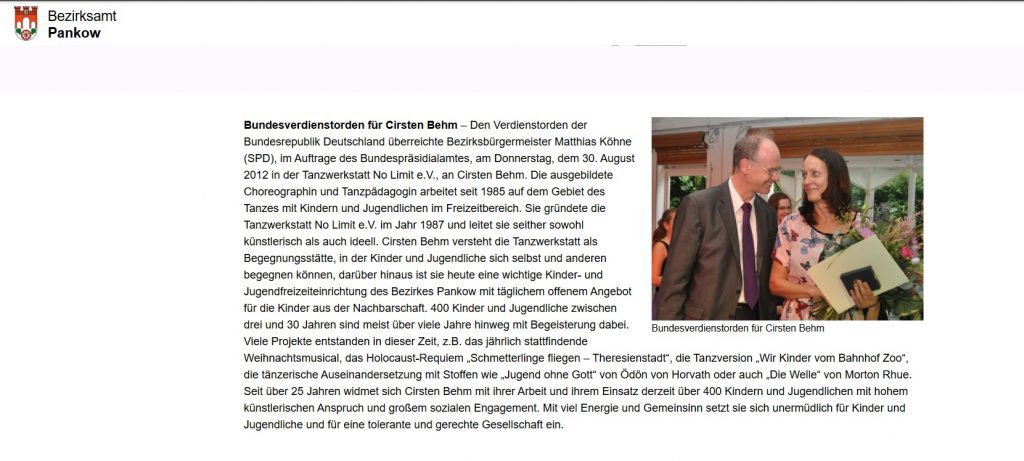 25 Jahre Tanzwerkstatt NO LIMIT e.V. – Am 30. August wird Cirsten Behm das Verdienstkreuz am Bande des Verdienstordens der Bundesrepublik Deutschland verliehen.